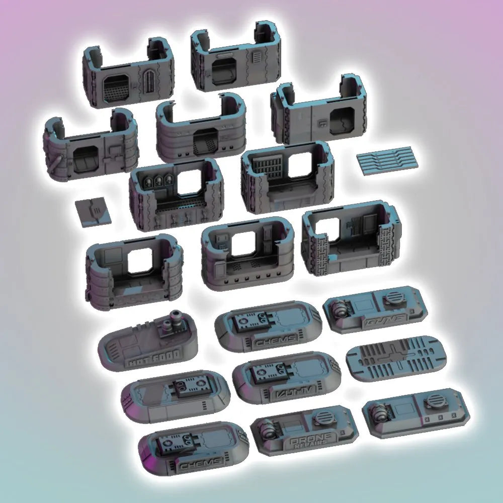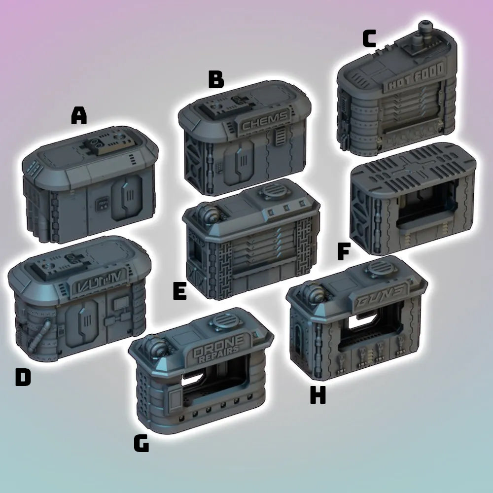 The interchangeable kiosk bases and rooftops include a variety of cyberpunk and sci-fi aesthetics such as the Chem Store, Hot Food stall, Gun Shop, Drone Repairs and more! These are essential terrain for any city based terrain project.