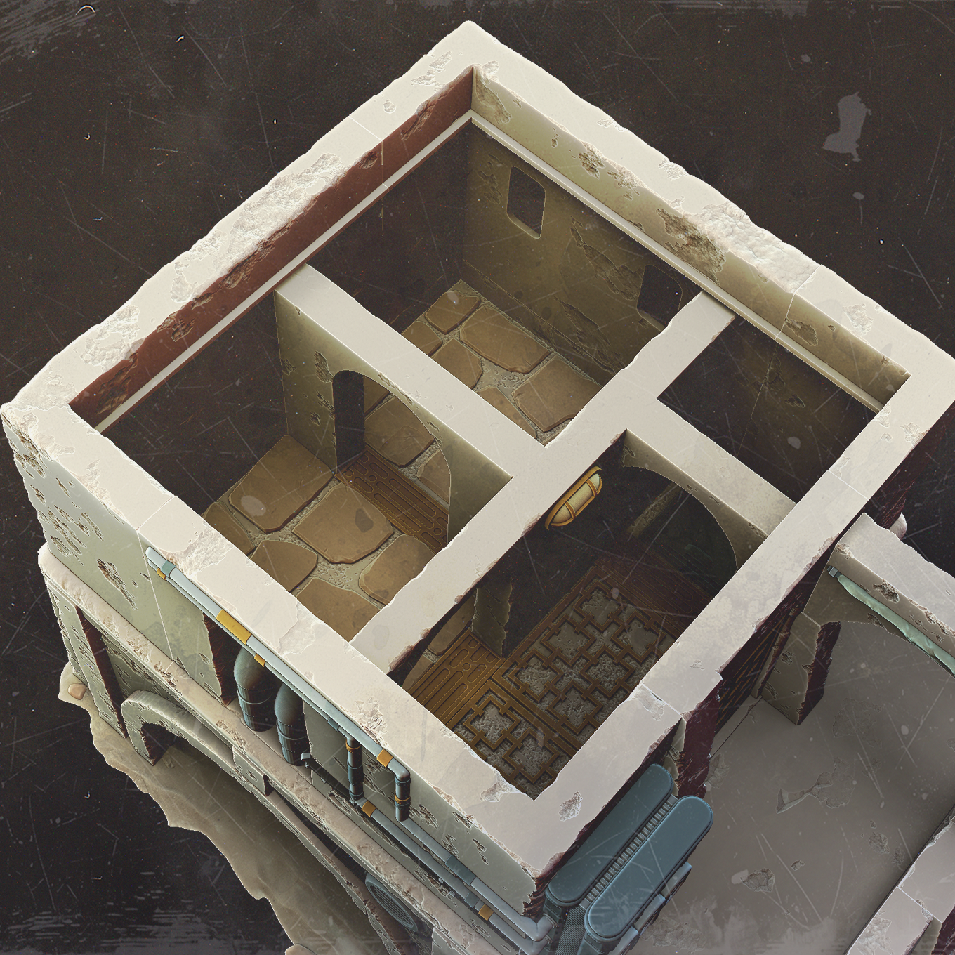 Tekmek's Wrench is a ramshackle, multi-level workshop, patched together as many times as the machines inside.